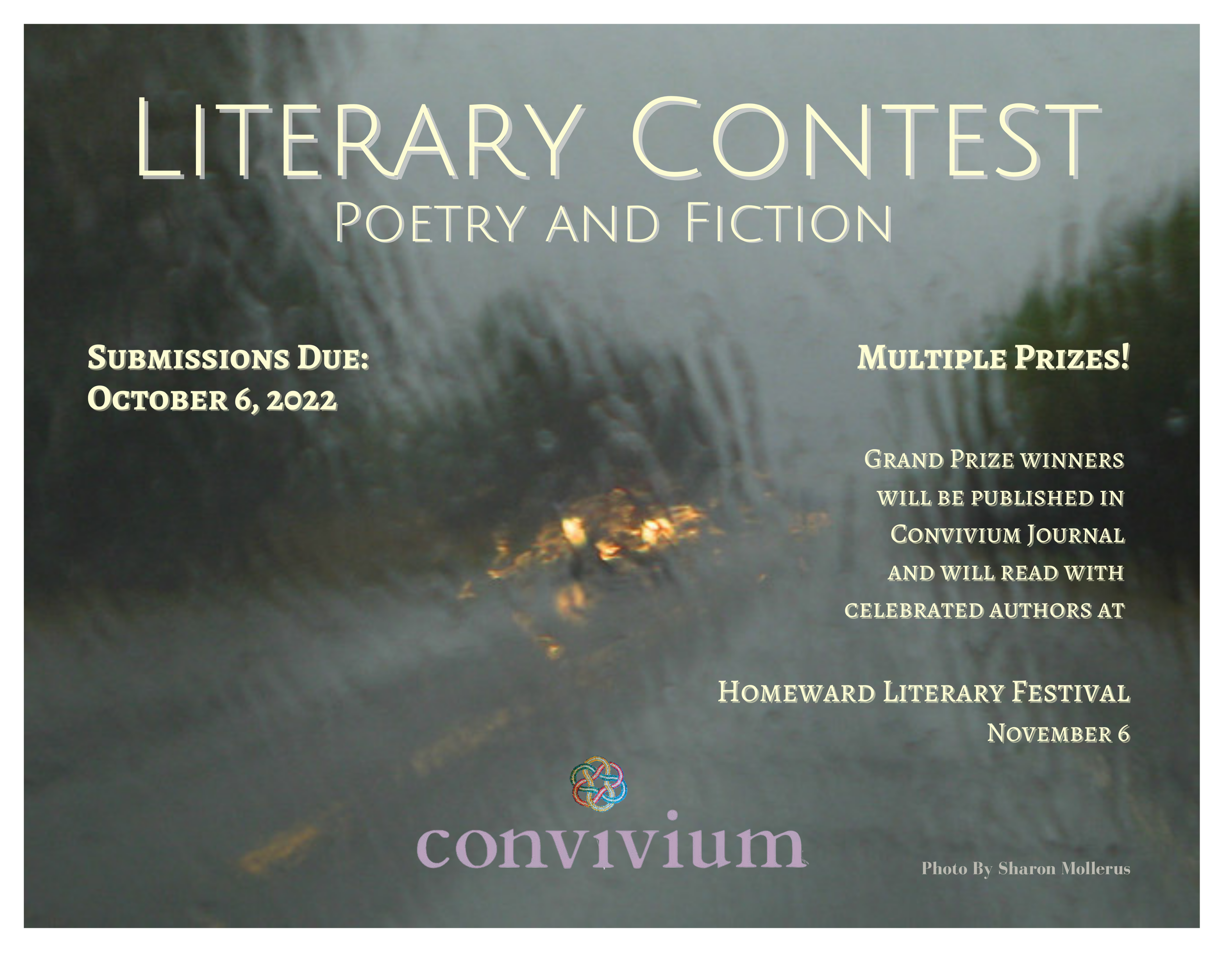 Grand Prize: Will be published in the next issue of Convivium; will read their poetry at the Homeward Literary Festival on November 6 with our guest poets: Jane Greer, Ewa Chrusciel, Andrew Calis, and Convivium Editor Elisabeth Kramp; $100 gift card to Leonardos